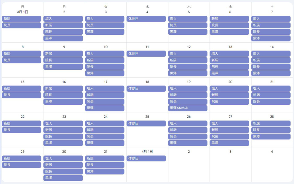 担当医出勤表(グーグルカレンダー)