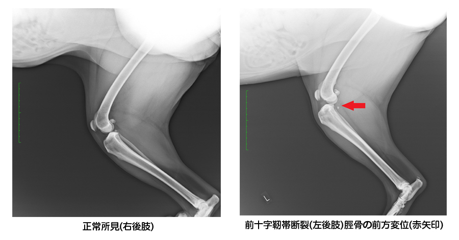 ◆診断 X線検査で脛骨ドローワー(脛骨引き出し兆候)、およびファットパッドサイン(関節包腫脹)を確認。 跛行検査と併せて、左後肢の前十字靭帯断裂を診断。 ◆手術 TPLO(脛骨高平部水平化骨切術)を実施 ◆経過