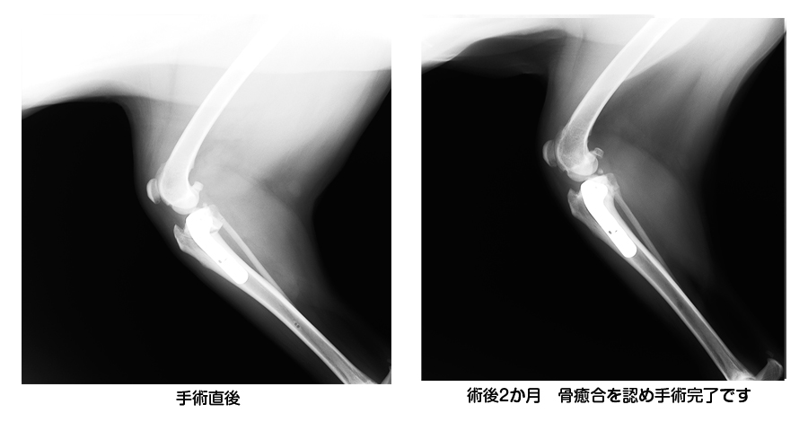 ◆診断 X線検査で脛骨ドローワー(脛骨引き出し兆候)、およびファットパッドサイン(関節包腫脹)を確認。 跛行検査と併せて、左後肢の前十字靭帯断裂を診断。 ◆手術 TPLO(脛骨高平部水平化骨切術)を実施 ◆経過